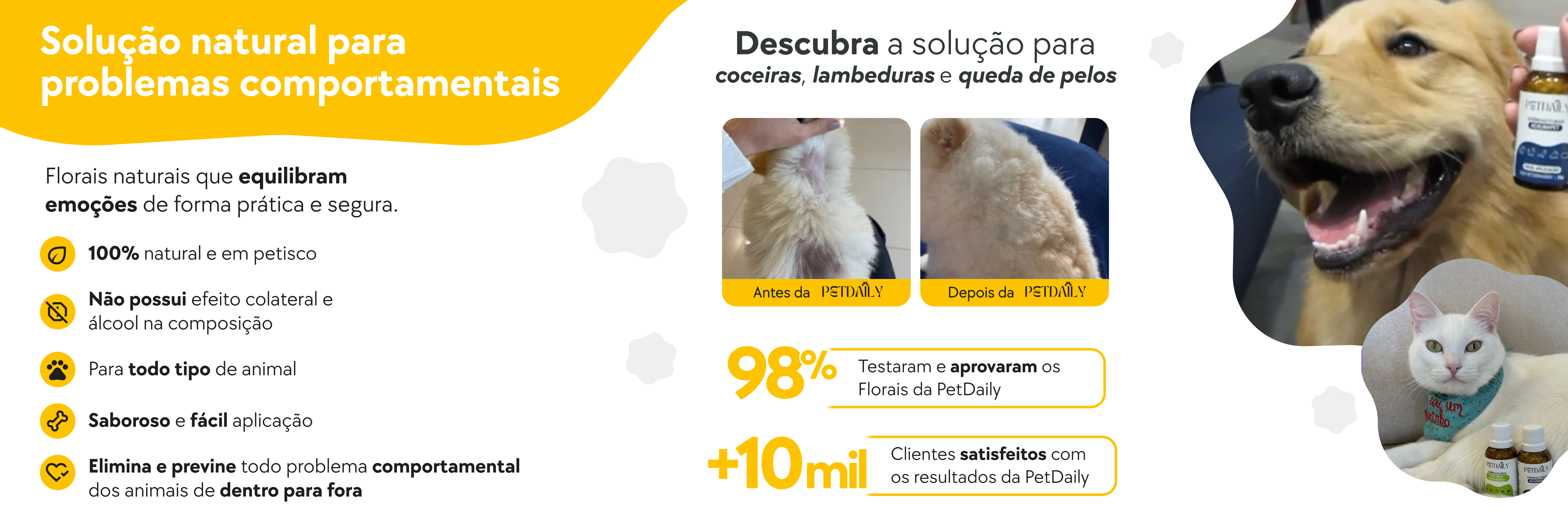 Os florais atuam no equilíbrio emocional dos pets, ajudando em situações como estresse, medos, hiperatividade e ansiedade. Já os suplementos são voltados para a saúde física, oferecendo suporte para articulações, pele, pelos, imunidade e mais.