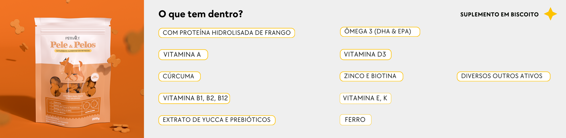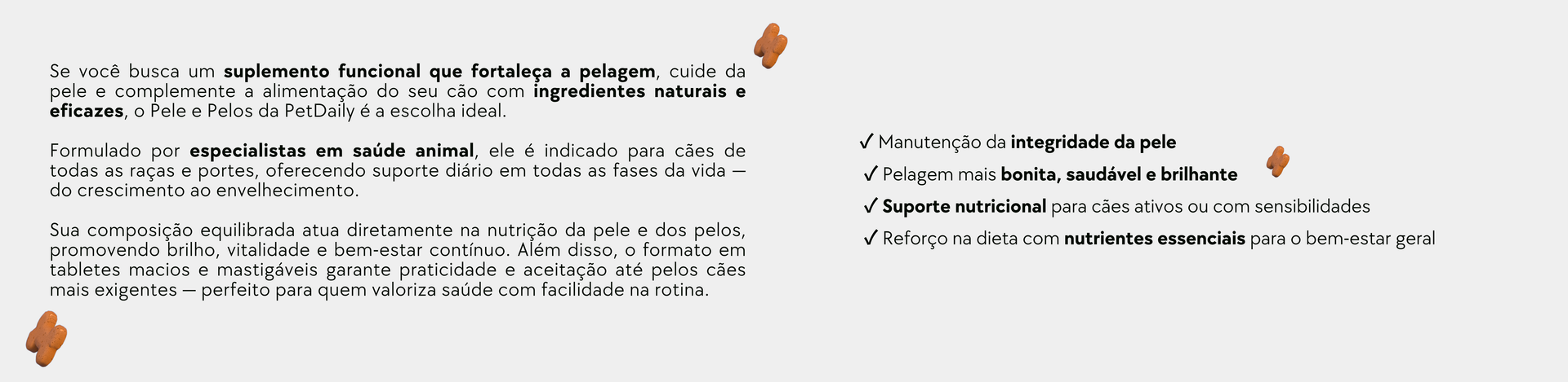 Os florais atuam no equilíbrio emocional dos pets, ajudando em situações como estresse, medos, hiperatividade e ansiedade. Já os suplementos são voltados para a saúde física, oferecendo suporte para articulações, pele, pelos, imunidade e mais. Ambos são oferecidos em formato de petiscos saudáveis e palatáveis por nós!